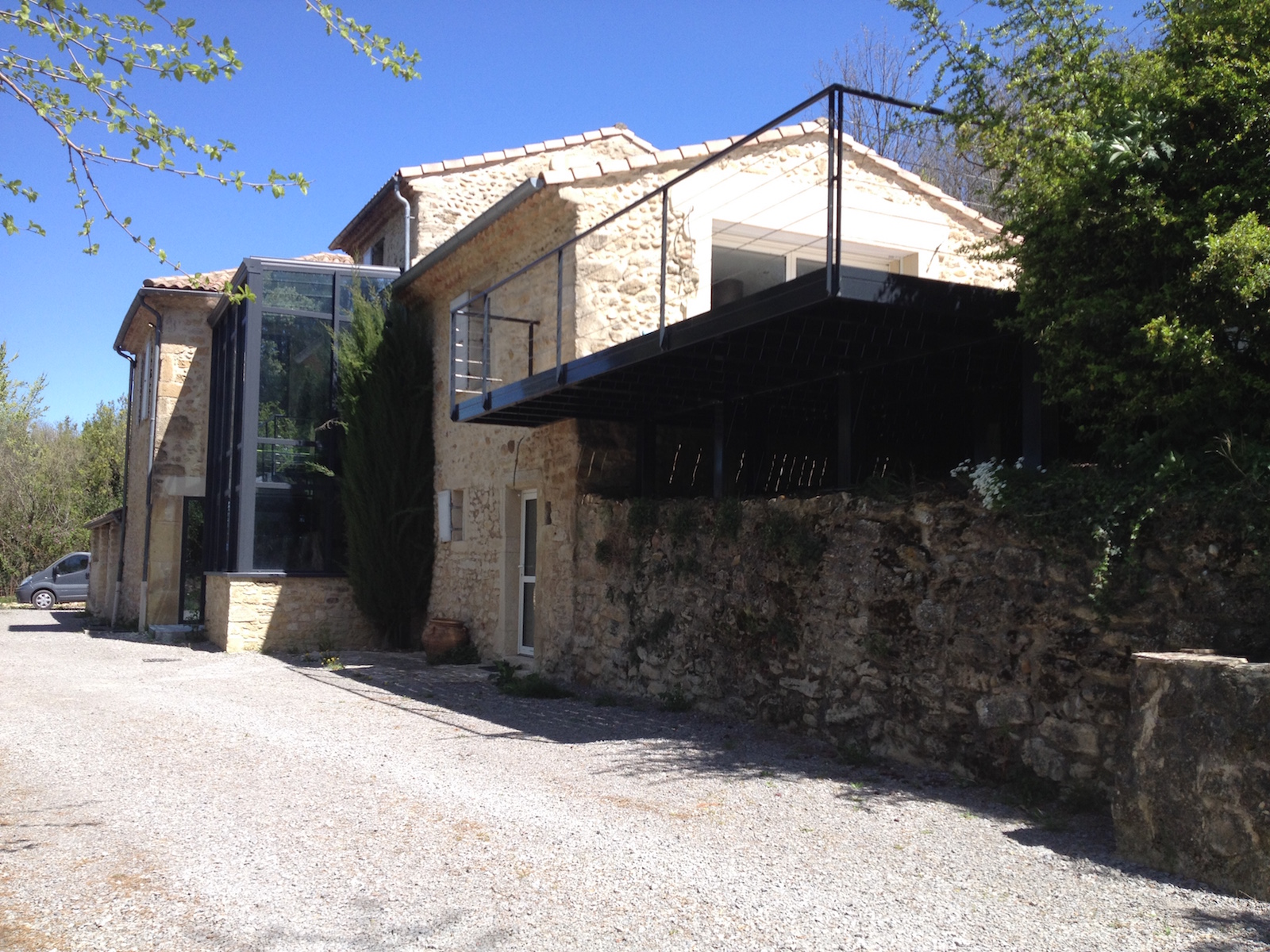 moderne acier veranda porte à faux lames de bois,architecte,drôme, ardèche,rénovation, réhabilitation, construction, neuf , ancien, ferme, architecture,ossature métallique, charpente métallique, bardage, industrie, tertiaire,patrimoine, bâtiment public,construction métallique,dessins, détails, pensée, réflexion, confiance, partenaire, paysage, maisons, logements, villas, thermique, écologie, économie, archicad, archiwizard, acier, matériaux, matérialité, ambiance, lumière,ombres, composition, assemblage
