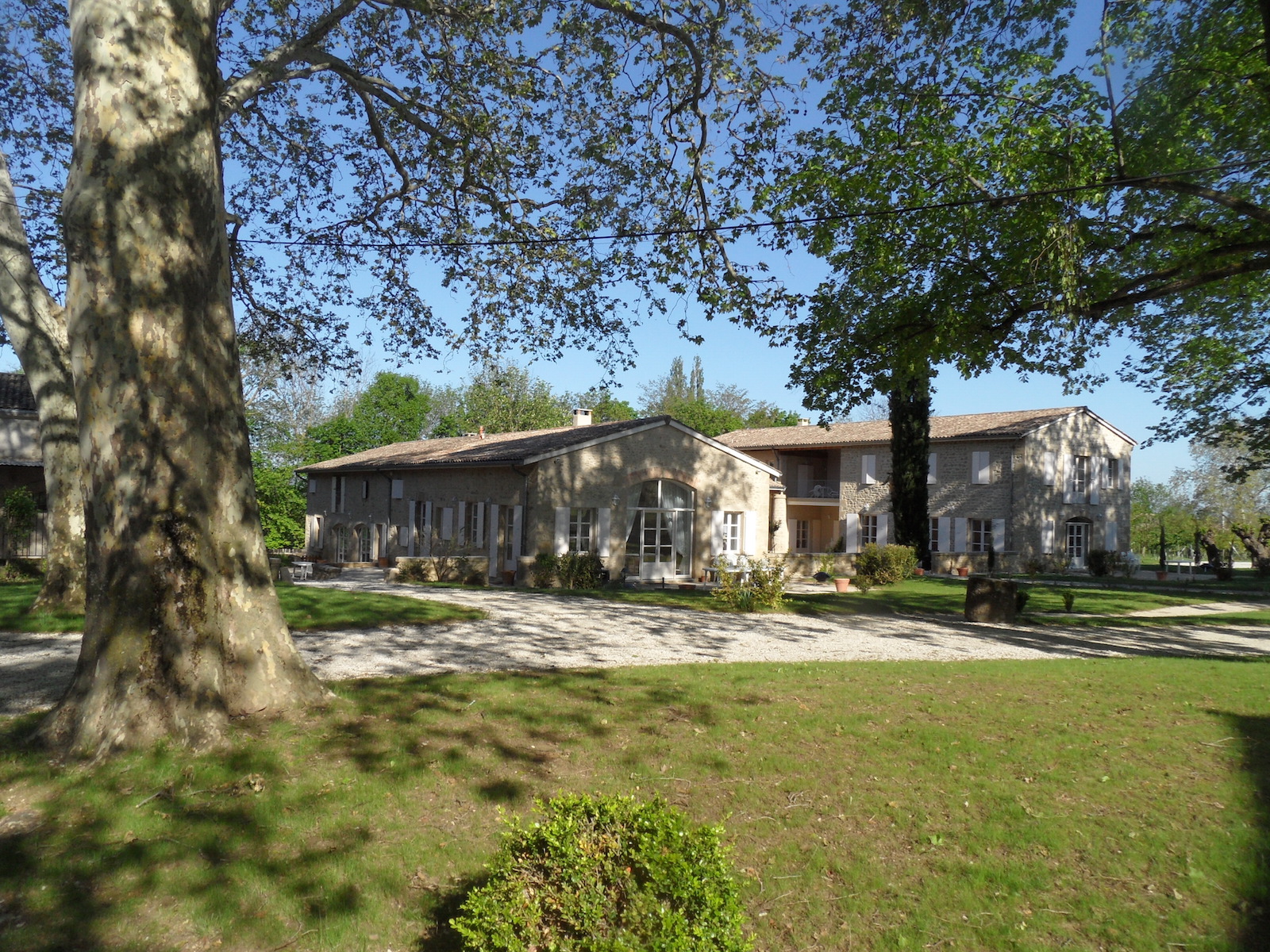 vue d’ensemble avec l’allée de platanes,architecte,drôme, ardèche,rénovation, réhabilitation, construction, neuf , ancien, ferme, architecture,ossature métallique, charpente métallique, bardage, industrie, tertiaire,patrimoine, bâtiment public,construction métallique,dessins, détails, pensée, réflexion, confiance, partenaire, paysage, maisons, logements, villas, thermique, écologie, économie, archicad, archiwizard, acier, matériaux, matérialité, ambiance, lumière,ombres, composition, assemblage